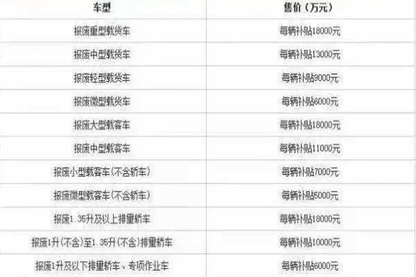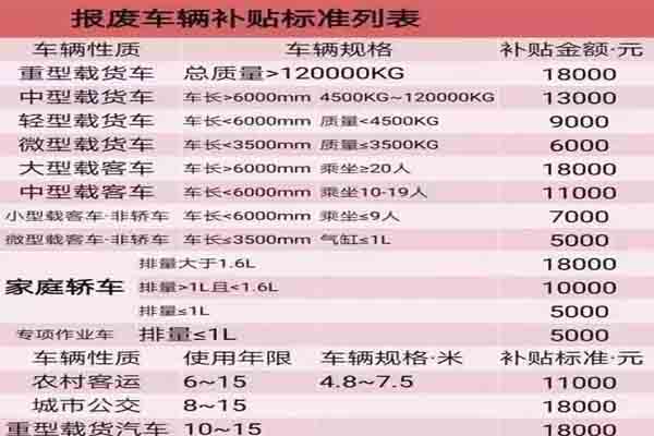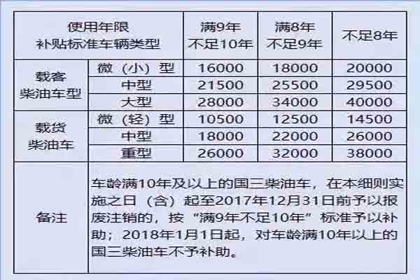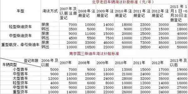 南京市   时间:2020年12月31日前,补贴标准:最高4万元/车,根据淘汰车辆的车型、使用年限给予差别化政府补贴。补贴标准为:国二汽油车2750-9500元/车,国三柴油车4000-40000元/车。南京市车主在2020年12月31日前办理报废的,其补贴申请截止日期为2021年1月31日。2021年及以后的淘汰补贴政策,将根据情况另行制定。  杭州市   时间:2019年12月31日前,待淘汰车辆:11万辆,补贴标准:最高4万元/车,补助资金的制定标准基于车辆的不同年限和车型:同期车辆车型越大价格越高、同型车辆年限越短价格越高,补贴从10500元至40000元不等。从表里可以看出:满8年不足9年的话,小型载客柴油车补贴是18000元,而满9年不满10年的补贴就变成了16000元,这里有2000块的差价。