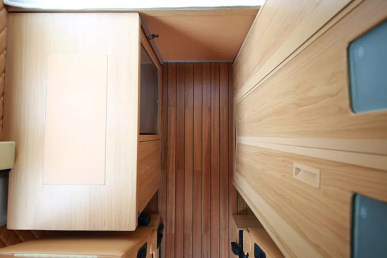 床铺下方设计一个超大的储物空间,可以把被套、不常用的日用品、杂物及一些出行必备的行李可以放入其中,另外,后部中间行李箱与室内是相通的,所以在内部拿行李也方便快捷。在后卧铺上方还安装了两个大的吊柜,可以放一些被套等床上物品。