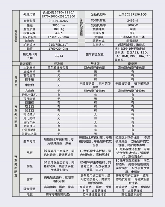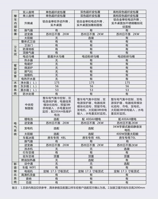六、配置参数程力雅舒特CLW5046XLJS5型房车——大通V80长轴高顶旅居版配置表:
