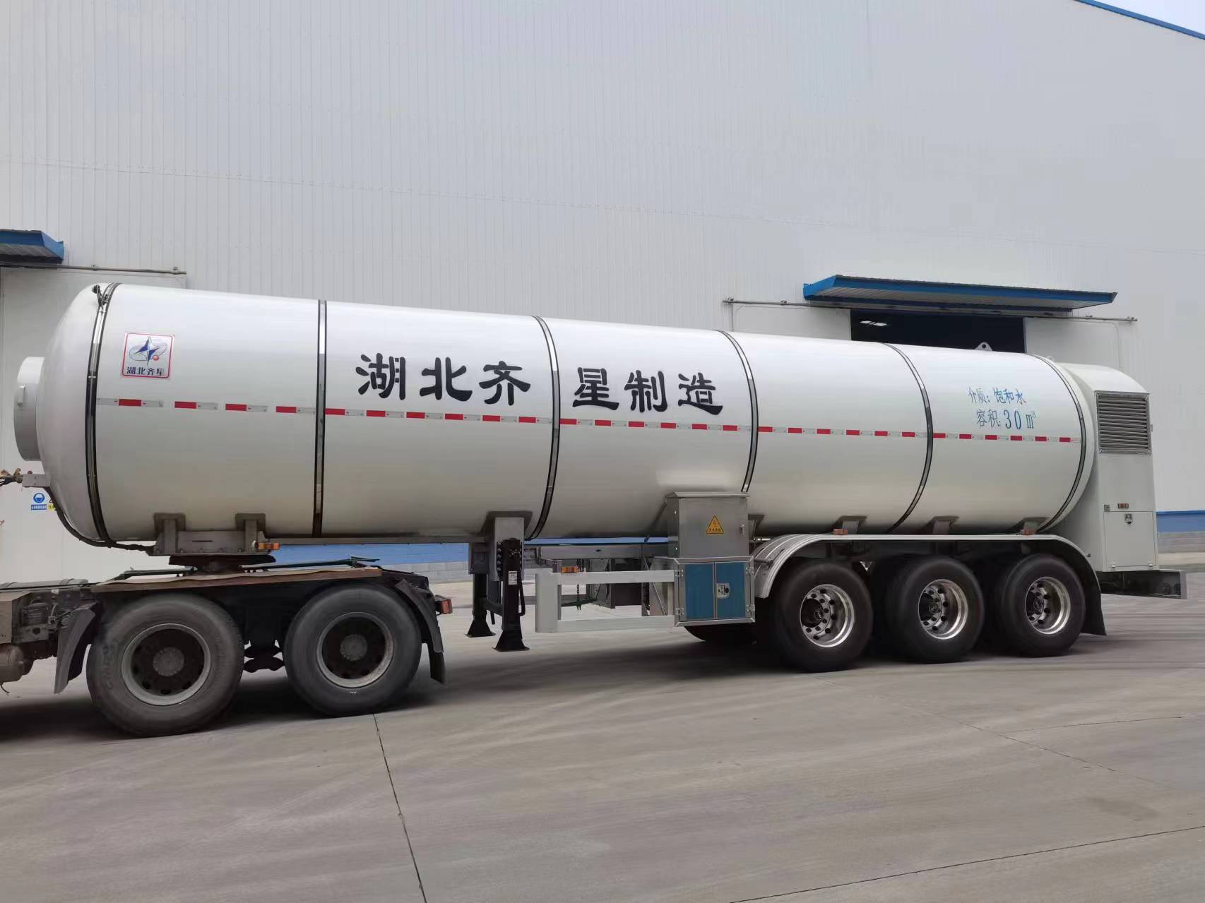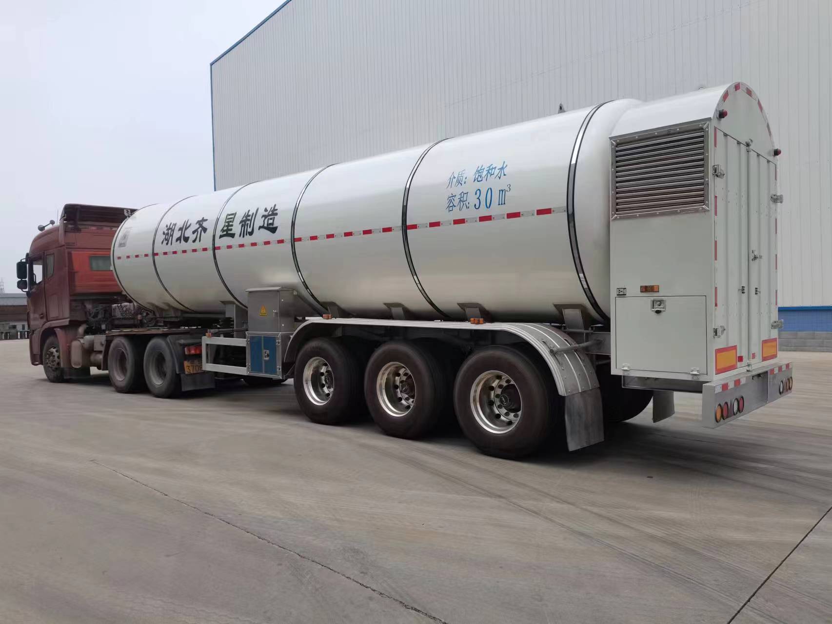 我厂设计生产的移动供热车外型简洁美观、操作简单、安全方便、机动灵活,放热温度和时间可适时控制调节,可为终瑞用户提供3公斤~30公斤压力,150º~239.4º的高温高压蒸汽。充热时间30~45分钟,两个放热口,20分钟左右时间就能卸完,具有蓄热温度高、充放热时间短、蓄热量大、热转换率高、运行效率高、综合性价比高等特点,下图为实际运营中的高压蒸汽运输车,运行安全平稳,冲放热效果显现。