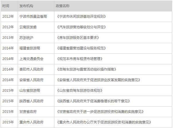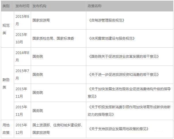 规范类政策 (1)《自驾游管理服务规范》 规定了自驾游组织机构、管理服务系统、路线与服务、合同与文件、人员、工作车及设备、安全与应急等管理的基本要求。 (2)《休闲露营地建设与服务规范》 提出了休闲露营地通用的基础性规范要求。第一部分导则,突出了安全、环保和自助服务;第二部分自驾车营地,对选址、规划、功能区、服务设施和质量提出了具体 要求;第三部分帐篷露营地,规定了帐篷露营地的分类、选址与布局、服务及质量要求;第四部分青少年营地,结合青少年的身心特点,全面细致的对相关指标进行规定。 鼓励类政策 (1)《关于进一步促进旅游投资和消费的若干意见》 《意见》第一次将露营旅游呈现在国家发展台面。提出了6个方面、26条具体政策措施,以充分挖掘旅游投资和旅游消费增长潜力。并在时间节点和量级规模上对自驾 车、房车营地作出明确要求。制定全国自驾车房车营地建设规划和自驾车房车营地建设标准,明确营地住宿登记、安全救援等政策,支持少数民族地区和丝绸之路沿 线、长江经济带等重点旅游地区建设自驾车房车营地。到2020年,鼓励引导社会资本建设自驾车房车营地1000个左右。 (2)《关于加快发展生活性服务业促进消费结构升级的指导意见》 《意见》明确指出,今后一个时期,重点发展包括房车露营在内的贴近服务人民群众生活、需求潜力大、带动作用强的生活性服务领域,推动生活消费方式由生存型、传 统型、物质型向发展型、现代型、服务型转变。提出“适应房车、自驾车、邮轮、游艇等新兴旅游业态发展需要,合理规划配套设施建设和基地布局。” (3)《关于积极发挥新消费引领作用加快培育形成新供给新动力的指导意见》 《意见》首次将房车露营定调为“基础设施建设”。露营地将着重发挥“基础设施网络支撑”作用,通过“系统构建和完善基础设施体系”,“加快旅游咨询中心和集散中心、自驾车房车营地、旅游厕所、停车场等旅游基础设施建设”,以“适应消费结构、消费模式和消费形态变化”。 (4)《国务院关于促进旅游业改革发展的若干意见》 指出建立旅居全挂车营地和露营地建设标准,完善旅居全挂车上路通行的政策措施。 用地政策 国土资源部、住房和城乡建设部、国家旅游局联合发布《关于支持旅游业发展用地政策的意见》,在用地政策方面提出了诸多利好,包括支持自驾车、房车营地旅游发 展建设,并明确提出营地用地按旅馆用地管理。这一举措,对推进露营地行业改革和行业产业化有重大意义,比如在吸引社会资本大规模进入方面将有积极的指导意 义,同时也为后续露营地项目的交易、兼并、合作提供了条件。此外,也让露营地的行政审批手续变得更加明确和简单。 地方政策 除国家层面大力扶持露营旅游产业发展外,地方各级政府也纷纷对这一朝阳产业制定规范、鼓励政策,以培育区域经济增长新动力。其中,《山东省自驾车旅游总体规 划》提出自驾游发展的关键就是自驾游配套和政府的单项规划,对自驾游存在的现实问题具有重大的指导意义。此外,陕西、甘肃、重庆等省市都明确提出规划建设 一批房车营地,重庆市还提出了具体目标:到2020年在全市规划建设自驾车房车营地50个。 地方关于露营旅游业鼓励政策如下表: