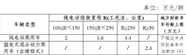 (一)新能源乘用车、插电式混合动力(含增程式)乘用车推广应用补贴标准如下: