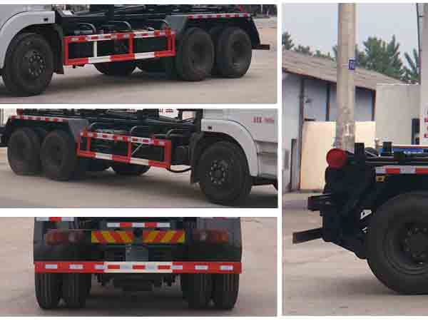 |  | 排放标准: | GB17691-2005国Ⅴ,GB3847-2005 |  | 轴数: | 3 | 前轮距: | 1940(mm) |  | 轴距: | 4350+1300,4750+1300,5900+1300,4900+1300,5350+1300 | 后轮距: | 1860/1860(mm) |  | 轮胎数: | 10 | 轮胎规格: | 10.00-20,10.00R20,295/80R22.5,11.00-20,11.00R20 |  | 燃料种类: | 柴油 | 弹簧片数: | 9/10 |  | 轴荷: | 7000/18000(二轴组) | 驾驶室乘人数: | 3 |  | 整车备注: | 1,防护材料:Q235A碳钢,连接方式:左右侧面防护与副梁均采用焊接连接,后下部防护与车架采用焊接连接,后部防护断面尺寸(mm):150×50,后部防护离地高度(mm):430。2,整车长度与轴距对应关系为(mm):8915/1515/4750+1300,8850/1450/4750+1300,8650/1250/4750+1300,8515/1515/4350+1300,8450/1450/4350+1300,8250/1250/4350+1300;轴距变化引起的质量变化在3%以内,可忽略不计。3,采用的发动机型号与油耗值对应关系为(L/100km):ISD210 50(34.8);YC6JA240-50(34.9);ISB210 50(35.7)。4,随底盘选装驾驶室,选装驾驶室遮阳板与侧面卧铺开窗口。5,该车安装具有卫星定位功能的行驶记录仪。ABS生产厂家: 东科克诺尔商用车制动系统(十堰)有限公司;型号:3631010-C2000。6,车辆颜色,文字喷涂及局部细节可变化。7、专用装置:拉臂机构,主要用于城镇环卫散装生活垃圾的收集与运输。 |  | 专用性能: | 公司专业生产东风福瑞卡垃圾车、东风多利卡垃圾车、东风140垃圾车、东风145垃圾车、东风153垃圾车等,用户可自带底盘,我厂提供上装部件的生产改装。公司生产的垃圾车具有结构简单、操作稳定方便、装卸效率高、机械化程度高、节省人力的优点。广泛适用于环卫、市政、厂矿企业、物业小区、垃圾多而集中的居民区。 车厢可卸载式垃圾车,又称勾臂式垃圾车、拉臂式垃圾车。该车广泛适用与城市街道学校垃圾处理,可一车配备多个斗,各个垃圾点放置多个垃圾斗,带自卸功能,液压操作,方便倾倒。该车的箱体部分完全由液压系统来控制,在平日里可将车载垃圾箱放置到各个垃圾收集站,待垃圾收集满后,该车可直接开赴至垃圾站,通过液压系统的操控,可将垃圾车后座上加装的勾臂放下,挂住站内垃圾箱前端的连接点,将垃圾箱拉至车体的后座上,此时即可启动车辆,将垃圾运送至垃圾处理站内,进行自卸式倾倒。该车最主要的优点就是可一车配多斗,一辆车就可以维持数个垃圾收集站的运转,效率高,且箱体为密封式设计,不会造成二次污染。