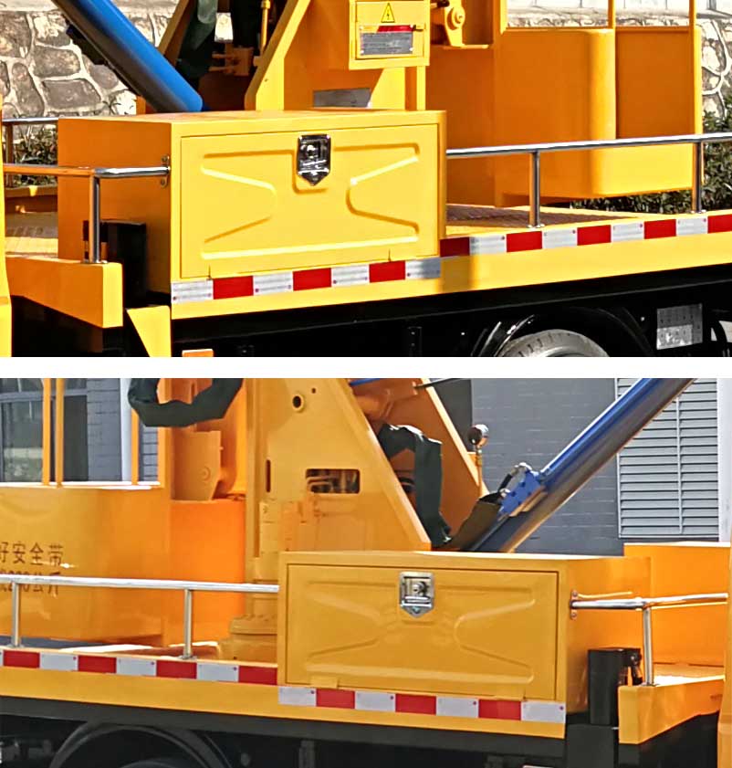在作业斗内和回转座上均设有操纵装置, 远距离控制发动机的启动/停止、高速/低速,采用电液比例阀控制臂的动作,平稳性好,工作臂可左、右360°连续旋转,靠连杆机构自动维持作业槽水平,主泵出现故障时可操纵应急泵下降作业槽,具备夜间照明,可起吊重物。车的支腿单独分开、可调、能实现整车在不平路上调平。整车移动方便,能适合狭窄的地段、小街小巷作业。产品被广泛用于电力、路灯、市政、园林、通信、机场、造(修)船、交通、广告、摄影等高空作业领域。