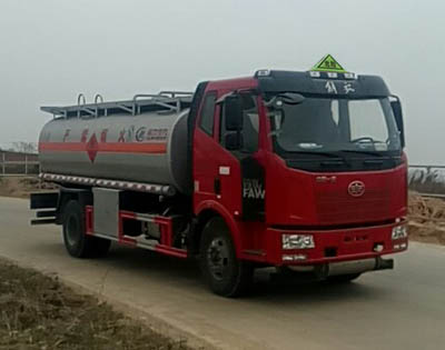 | | 解放J6FL型16.5方流动加油车   主要技术参数 底盘配置:新款解放J6排半可前翻宽驾驶室、配置收音机、暖风调节、6档变速箱、动力转向、空调、离合助力、气刹制动、断气刹、ABS、前盘、排气管前置、电动玻璃、中控锁。加厚高强度前保险杠。前雾灯、可调节水晶大灯、广角及前路面视镜。配备CA4DK1-18E51中国第一汽车集团公司189马力国五柴油发动机,10.00R20 18PR原厂钢丝胎,4700轴距。罐体基本配置:罐体有效容积为14.7立方,实际容积为16.5立方,采用武钢Q235优质国标5mm碳钢板材一次卷压成型,单仓带泵,配一个欧标罐口、一个海底阀(紧急切断装置)。罐体及各保险杠均贴红白色视觉反光条。罐体两侧贴有“爆”字,上面装有安全折叠升降护栏。配备正星大流量电脑税控加油机、自动回位卷盘、加油枪、专用油泵带取力器,后有防滑爬梯。可选装全套欧标(另加装下装油、油气回收、防溢流探杆及防溢流探杆插座共计加7000元)。