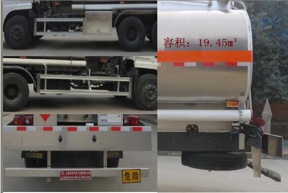 |  | 排放标准: | GB17691-2005国Ⅴ,GB3847-2005 |  | 轴数: | 3 | 前轮距: | 1940(mm) |  | 轴距: | 4350+1300,5400+1300,5900+1300,4750+1300 | 后轮距: | 1860/1860(mm) |  | 轮胎数: | 10 | 轮胎规格: | 11.00-20 18PR,11.00R20 18PR |  | 燃料种类: | 柴油 | 弹簧片数: | 8/9,8/10,9/10,8/13,9/13 |  | 轴荷: | 7000/18000(二轴组) | 驾驶室乘人数: | 3 |  | 整车备注: | 1,罐体有效容积为19.45立方米, 危险货物运输车辆的类型为:FL型车辆,类项号为:3;2,罐体外形尺寸:长×长轴×短轴(mm)(含封头):7200×2350×1600;3,侧面及后下部防护装置的材料均为Q235A,侧防护装置与车辆螺栓联接,后防护装置与车架焊接,后防护装置断面尺寸为100mm×50mm,后防护装置离地高度为500mm; 4.限速装置时速80km。安装有卫星定位功能的行驶记录仪。采用前盘制动器,排气管,消声器前置的底盘。仅采用子午线胎,选装工具箱安装位置;5.ABS生产厂家/型号: 威伯科汽车控制系统(中国)有限公司(ABS-E 4S/4M)/东风电子科技股份有限公司汽车制动系统公司(3631010-C2000);6,发动机对应油耗值 (L/100km)为YC6JA240-50/37.0, ISD245 50/ 36.5,ISB220 50/36.6。 |  | 专用性能: | 本公司改装生产的油罐车均采用国内成熟的原装底盘进行改装,用户也可自带底盘(必须与公告底盘型号一致),我厂提供上装部件的生产改装。油罐车均可设计成化工车。油罐车均可配备电脑加油机。油罐车宽范围的上户吨位选择,以满足用户需求。。 罐体材质:碳钢、不锈钢、钢衬塑、玻璃钢、全塑罐(聚乙烯)。罐型:方圆形、椭圆形、圆形。油罐车罐体内设多道防波隔板。采用高压气体试漏检测,使罐体具有强度高,重心稳,车辆运载安全平稳等特点。油泵:自吸泵、齿轮泵、化工泵、不锈钢泵。油表:单计数、双计数、税控加油机。