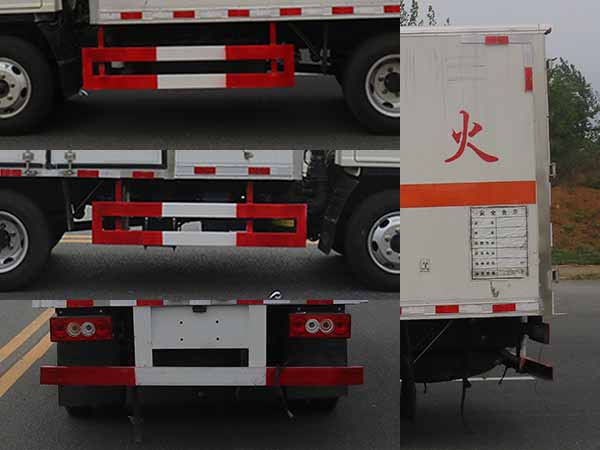 |  | 排放标准: | GB3847-2005,GB17691-2018国Ⅵ |  | 轴数: | 2 | 前轮距: | 1495,1415(mm) |  | 轴距: | 2850 | 后轮距: | 1435(mm) |  | 轮胎数: | 6 | 轮胎规格: | 6.50R16LT 10PR |  | 燃料种类: | 柴油 | 弹簧片数: | 7/7+5 |  | 轴荷: | 1617/2878 | 驾驶室乘人数: | 2 |  | 整车备注: | 1、厢体顶部封闭,不可开启;2、选装侧门型式及位置,选装百叶窗;3、选装侧门对应外形尺寸宽度1940mm,不带侧门对应宽度1900mm;4、排气管前置;采用前轮盘式制动器,安装辅助制动装置.只装用子午线轮胎,ABS系统控制方式为4S/4M,ABS型号为CM4XL-4S/4M,生产厂家为广州瑞立科密汽车电子股份有限公司,安装符合规定的具有卫星定位功能的行驶记录仪;5、该车用于运输具有独立容器(瓶)包装的:黑火药,压缩黑火药,电引爆雷管,爆破炸药,点燃导火索,类项号:1.1D,1.1D,1.1B,1.1D,1.4G;该车为危险货物运输车,车辆类型EX/Ⅱ型;6、防护装置材料:侧面防护及后下部防护装置材料材质:冷弯型钢/Q235,连接方式:焊接,后下部防护装置截面尺寸120mm×60mm,离地高度420mm;7、Q23-115E60发动机油耗值为11.40L/100km;8、装限速装置,限速80km/h。 |  | 专用性能: | 我公司专业生产东风系列、江铃系列、江淮系列、北汽系列、庆铃系列、解放系列等爆破器材运输车,厢体为双层金属骨架结构,外部为冷扎钢板,内壁采用铝合金板蒙面,夹层为隔热阻燃材料填充。设置对开门,如需安装抗暴容器则增开侧门,侧壁设有防雨功能自然通风窗口,以使厢内外空气流动,厢体内部做防静电处理,厢体底部与厢内前部铺有阻燃导静电胶板,并与底盘等电位连接,通过车辆后端的导静电装置与大地相连,可防止静电火花的产生和车辆静电及时释放,提高车辆的安全性。厢体内部前面和侧面装有固定拉环,与捆绑带使用捆绑货物以避免移动确保安全。 |  | 多方位图: |