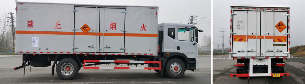 | | 东风多利卡D9厢长7.68米爆破器材运输车    主要技术参数 底盘配置:采用东风多利卡D9平头带卧EQ1185L9CDFWXP底盘,排半可前翻驾驶室,D4.5NS6B220东风康明斯发动机有限公司220马力国六柴油发动机,8档变速箱,295原厂真空胎,带ABS、带前盘式制动、限速、排气管前置、方向助力、空调 、电动玻璃、中控锁、大灯高度可调,行车记录仪,带空气悬架后桥,有防爆胎装置,刹车片预警装置,安全带未系提示,安装防飞溅档泥板,三角垫木,反光背心,5600轴距,外型尺寸9150×2550×3890,额定载重9990公斤,有燃油安全达标,有环保,不超重。厢体配置:厢体尺寸7680×2400×2400,厢体外饰釆用可产生静电屏蔽效应的1.2mm冷扎钢板,中间附以4cm阻燃泡沫层,内饰1mm铝板,厢体底板釆用4mm防爆钢板制作。厢体右侧带侧门,后尾部双开门,厢内安装固定运载物的卧环或卡槽,厢体内顶部中间安装防燃烟雾报警器,后门及侧门安装防盗报警器,前置防撞防静电胶皮,厢体底部铺防静电胶皮,厢体颜色为黄色(可根据用户要求变换厢体颜色),可加装前后左右4个全景摄像头及倒车影像(加装加2000),实时全程监控(32G内存卡抽出可在手机或电脑上播放,自动覆盖更新),带危险品三角灯,防火罩,两只灭火器,其余标配。