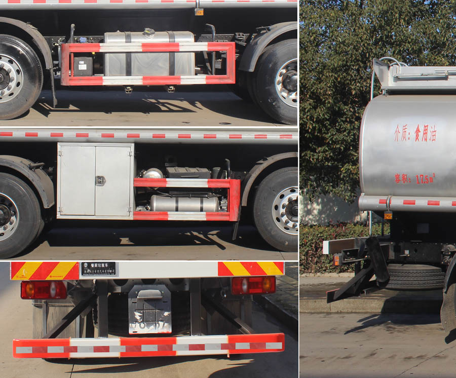|  | 排放标准: | 国六 |  | 轴数: | 3 | 前轮距: | 1910/1910,1940/1940,1965/1965,2005/2005(mm) |  | 轴距: | 1995+2700,1995+3600,1995+4100,1995+5250,1995+5450,1995+4400,1995+4600,1995+5000 | 后轮距: | 1860(mm) |  | 轮胎数: | 8 | 轮胎规格: | 11.00R20 18PR,295/80R22.5 18PR |  | 燃料种类: | 柴油 | 弹簧片数: | 9/9/10+8,10/10/10+8,10/10/11+8,3/3/4+3 |  | 轴荷: | 7000/7000/11000 | 驾驶室乘人数: | 2,3 |  | 整车备注: | 随底盘选装驾驶室.运输介质:食用油, 密度:900千克/立方米.罐体总容量17.5立方米,有效容积16.67立方米.罐体外形尺寸(长×长轴×短轴)(mm): 6300×2450×1520.侧、后防护材料为Q235B,侧防护与车架螺栓连接,后防护与车架焊接连接,后部防护装置断面尺寸(宽×高)50×120(mm),后部防护离地高度:490mm.该车型.安装带有卫星定位功能的行驶记录仪.ABS型号为3631010-C2000,生产厂为东科克诺尔商用车制动系统(十堰)有限公司.发动机D4.5NS6B220,B6.2NS6B245,B6.2NS6B260,D6.7NS6B290,D6.7NS6B320对应油耗值分别为29.9,31.1,31.1,30.1,30.1L/100km.选装ETC车载装置。 |  | 专用性能: | 本公司改装生产的油罐车均采用国内成熟的原装底盘进行改装,用户也可自带底盘(必须与公告底盘型号一致),我厂提供上装部件的生产改装。油罐车均可设计成化工车。油罐车均可配备电脑加油机。油罐车宽范围的上户吨位选择,以满足用户需求。。 罐体材质:碳钢、不锈钢、钢衬塑、玻璃钢、全塑罐(聚乙烯)。罐型:方圆形、椭圆形、圆形。油罐车罐体内设多道防波隔板。采用高压气体试漏检测,使罐体具有强度高,重心稳,车辆运载安全平稳等特点。油泵:自吸泵、齿轮泵、化工泵、不锈钢泵。油表:单计数、双计数、税控加油机。