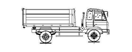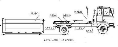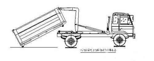 第三步.当拉臂钩钩到箱体弯钩时,继续推下拉臂操作手柄到落下位置,使垃圾箱体继续上车(注意:保证垃圾箱体的纵梁位于附车架尾部两后滚轮之间)。如图: