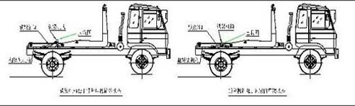 在装载垃圾前,空载运转达到6个标准气压时,挂上取力器(驾驶室内方向盘左下方),检查各部件有无泄漏或异常后,再按照操作指示牌指示位置进行操作。其具体操作步骤如下: