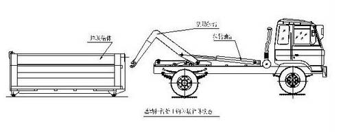 第二步.将勾臂式垃圾车拉臂操作手柄拉起到伸起位置,拉臂油缸伸出,活动拉臂绕翻转翻转架前铰链轴旋转,拉臂处于钩箱位置,适当调整拉臂钩高度并与箱体弯钩对准。如图: