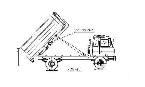 第五步. 在勾臂式垃圾车卸垃圾前,整车运转达到6个标准气压时挂上取力器,打开垃圾箱后门锁紧装置,在前级二联多路阀处,首先确定锁紧架锁紧垃圾箱体(拉起锁紧钩操作手柄至锁紧位置),然后拉起拉臂操作手柄至伸出位置,垃圾箱体备倾斜举起垃圾卸出。如图: