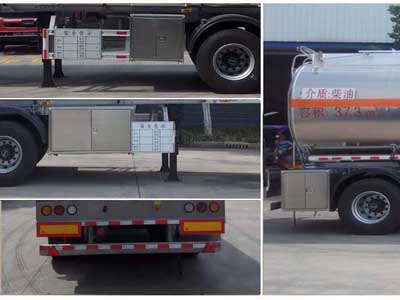 | | 37.3方柴油3类铝合金运油半挂车    主要技术参数 |  | 产品名称: | 铝合金运油半挂车 | 外型尺寸: | 9800×2500×3750(mm) |  | 底盘型号: |  | 货厢尺寸: | ××(mm) |  | 总质量: | 35000(Kg) | 接近/离去角: | -/18(°) |  | 额定质量: | 29500(Kg) | 前悬后悬: | -/1500(mm) |  | 整备质量: | 5500(Kg) | 最高车速: | (km/h) |  | 发动机 | 发动机生产企业 | 排量(ml) | 功率(kw) |  | 排放标准: |  |  | 轴数: | 2 | 前轮距: | -(mm) |  | 轴距: | 5400+1310 | 后轮距: | 1840/1840(mm) |  | 轮胎数: | 8 | 轮胎规格: | 11.00R20 12PR,12R22.5 12PR |  | 燃料种类: |  | 弹簧片数: | -/8/8 |  | 轴荷: | -/18000(二轴组) | 驾驶室乘人数: |  |  | 整车备注: | 罐体有效容积:37.3立方米, 运输介质:柴油 ,煤油 ,汽油,密度分别为: 830千克/立方米,820千克/立方米,700千克/立方米; 类项号:3,罐体外型尺寸(长×宽×高)mm:9500×2500×2050。防护材料:Q235A碳钢,连接方式:左右侧面及后下部防护均采用焊接连接,后部防护断面尺寸(mm):140×50,后部防护离地高度(mm):530。ABS生产厂家:广州市科密汽车制动技术开发有限公司,ABS型号: CM2XL-4S/2K(4S/2M)。 |  | 专用性能: |  |  | 多方位图: |