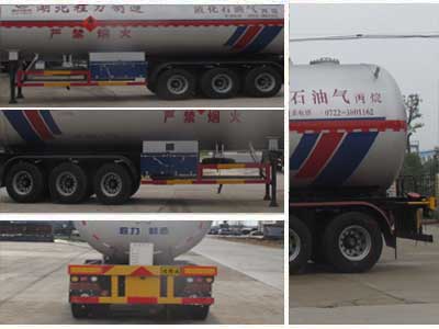 | | 59.5方液化石油气(丙烷)2.1类液化气体运输半挂车   主要技术参数 |  | 产品名称: | 液化气体运输半挂车 | 外型尺寸: | 13000×2500×3990(mm) |  | 底盘型号: |  | 货厢尺寸: | ××(mm) |  | 总质量: | 40000(Kg) | 接近/离去角: | -/17(°) |  | 额定质量: | 24990(Kg) | 前悬后悬: | -/1540(mm) |  | 整备质量: | 15010(Kg) | 最高车速: | (km/h) |  | 发动机 | 发动机生产企业 | 排量(ml) | 功率(kw) |  | 排放标准: |  |  | 轴数: | 3 | 前轮距: | (mm) |  | 轴距: | 7230+1310+1310 | 后轮距: | 1840/1840/1840(mm) |  | 轮胎数: | 12 | 轮胎规格: | 11.00R20 12PR,12R22.5 12PR |  | 燃料种类: |  | 弹簧片数: | -/4/4/4,-/7/7/7 |  | 轴荷: | -/24000(三轴组) | 驾驶室乘人数: |  |  | 整车备注: | 运输介质:液化石油气(丙烷),单位容积充装质量为0.42吨/立方米,类项号:2.1;罐体有效容积:59.5立方米, 罐体外形尺寸(长度×直径)(mm):12781×2500(直线段长11430)。采用适用于牵引危险品运输半挂车的牵引车。防护材料:Q235碳钢,连接方式:左右侧面及后下部防护均采用焊接连接,后部防护断面尺寸(mm):130×50,后部防护离地高度(mm):500。ABS生产厂家:广州市科密汽车制动技术开发有限公司,ABS型号:CM2XL-4S/2K(4S/2M)。 |  | 专用性能: |  |  | 多方位图: |